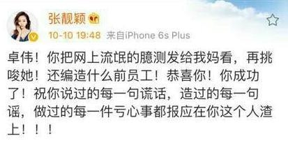 张靓颖的妈妈发公开信,明白反对女儿和冯轲的婚事;然后,张靓颖的妈妈又承受采访,再爆准女婿冯轲“新料”后,张靓颖将怒气撒在采访妈妈的人身上,微博上痛斥卓伟造谣。张靓颖在微博宣称卓伟扯谎造谣,并痛骂卓伟。