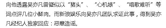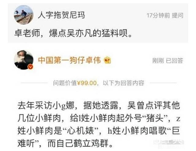 有网友向卓伟提问“爆点吴亦凡的猛料呗”,卓伟在回答中称小g娜曾向其透露,吴亦凡曾分别用“猪头”、“心机婊”、“唱歌难听”来点评李易峰、张艺兴鹿晗、黄子韬。