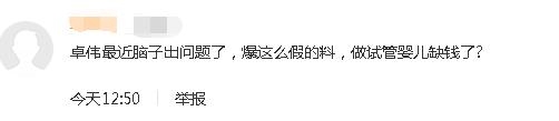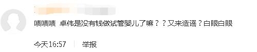 也有网友嘲讽卓伟也许是做试管婴儿(早前曾有网友目击疑似卓伟携一女子现身泰国一家以做试管婴儿出名的医院)缺钱了,所以疯狂的造谣赚钱。