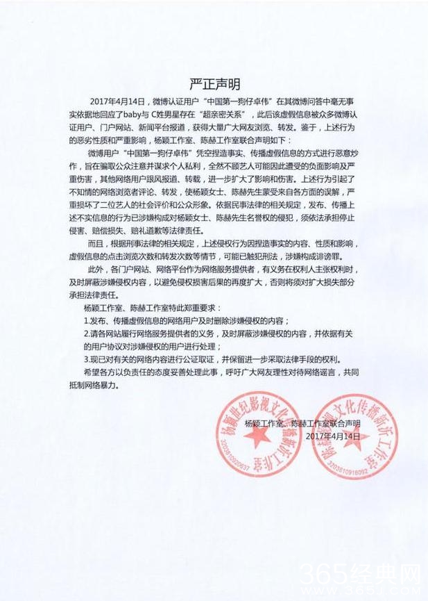 对此传闻,baby和陈赫的工作室相继通过微博发声明,称文中“爆料”内容全部为谣言,与事实严重不符,已采取法律手段。