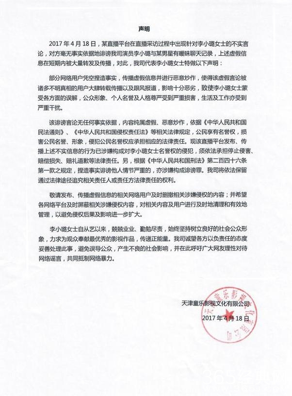 李小璐方面马上回应称对方消息不实,并侵犯了李小璐名誉权等,要求追求责任,删除不实内容,消除不良影响。