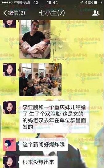 离婚后的李亚鹏被网友爆料和一个重庆妹子再婚了,并且生了一对双胞胎。爆料中还有两张照片,第一张疑似李亚鹏的男子抱着双胞胎,第二章则是一张全家福。