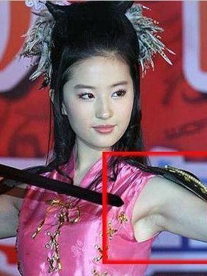 素被称为“天仙”的刘亦菲就曾在某活动宣传现场身穿粉红色劲装,手握小木剑,英姿飒爽,然而腋下露出的未刮干净的腋毛有点破坏美感。但也不得不说,刘亦菲的盛世美颜在这种渣像素下还是妥妥的少女感十足。