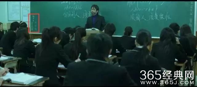 教室黑板拐角处写的值日生名字是方文山和黄俊郎,两人都是为周董歌曲填词的著名音乐人。