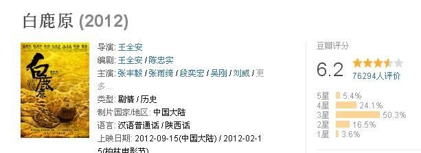 2012年王全安执导的电影《白鹿原》饱受争议,豆瓣评分只有6.2,票房亦不甚理想。