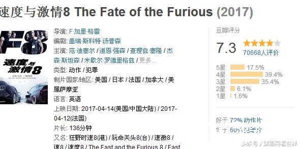 《速度与激情》之八,正在国内热映,票房成绩斐然,豆瓣评分7.3分尽管没有达到预想,但也不算低。毫无悬念的是整个4月的电影市场就是《速8》的天下,至于那几部不看形势顶风抢映的国产片基本上已经被杀的体无完肤。特别是打着周星驰怀旧旗号的所谓加长版《大话西游之大圣娶亲》,重拳之下也毫无还收之力,估计很快就下线了。这倒也不奇怪,毕竟《大话西游》是20年前的电影,星迷们已经无数次看过并且熟悉到可以大段熟背台词。就算冲着怀旧,也没有道理花钱到电影院来重温吧。