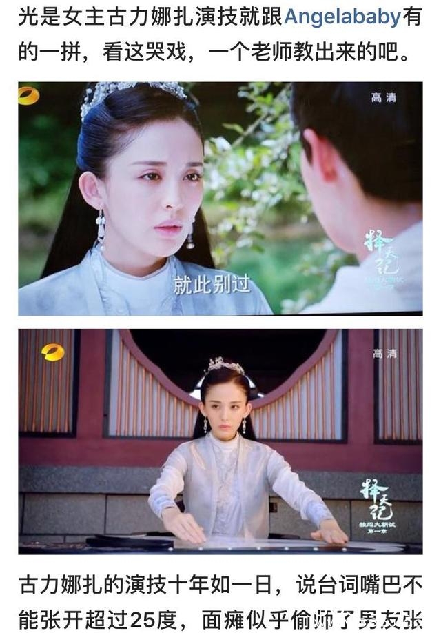 古力娜扎的演技也被吐槽没有长进,面对什么都是波澜不惊的,哭戏方面更是一言难尽,毫不客气的点评她演技一点进步都没有,好歹也是个入行好几年的演员了