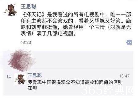 近日,有网友在网上爆料称,王思聪在微信圈里面点评了时下正在热播的电视剧《择天记》,并发表了自己观点称,鹿晗的演技实在是太尴尬了,和刘亦菲有的一拼,王思聪顺带还嫌弃了一把刘亦菲的演技实在是面无表情