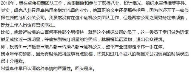 这位爆料人声称,卓伟不仅和明星合作,增加曝光度。甚至还会设计制造八卦来传播获利,如果真的如此,那就真的是太缺德了。