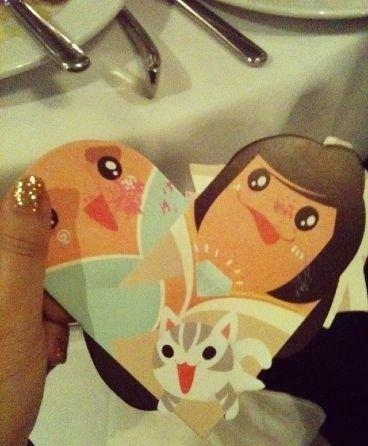 请柬是“土豆男孩”送“大嘴女孩”一枚钻戒,下方还有一只小猫据说是姚晨的爱猫“巴顿”,如果不是本人授意,别人是很难注意这么多细节来制作请柬的,看来姚晨和曹郁平日绝对是十分浪漫的人~