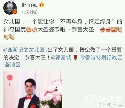 她说女儿国是一个能“不再让你单身”的国度,祝贺大圣娶亲,表面上一看好像是恭贺了郭富城结婚的好消息,但是仔细一思考,这么说的话,赵丽颖不是也是女儿国的一员吗,那不再单身也包括她自己咯。