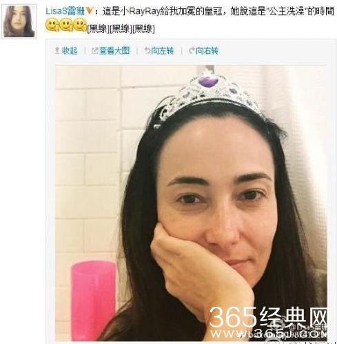 下面这张是吴彦祖女儿给妈妈戴的玩具皇冠,虽然鱼尾纹挺明显的,但看上去是满满的幸福啊~