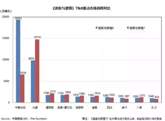 据统计数据显示,北美地区《速7》的首周票房是14716万美元,而《速8》的首周票房只有9879万美元,下降趋势明显。而在墨西哥、英国+爱尔兰、俄罗斯、德国、巴西、韩国、法国、印度,这些开画排名前十的海外市场,也都出现了不同程度的下跌。
