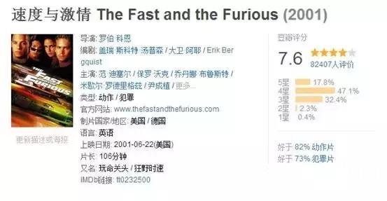 另外,不得不提下《速度与激情8》在两地口碑的差异:在豆瓣上该片一直稳定在7.5分上下,高于今年大热的《金刚:骷髅岛》和《极限特工3:终极回归》,以后两者平均40%的首周占比预估,《速度与激情8》的票房上限将超过30亿元;而从上周至今,《速度与激情8》在烂番茄上的新鲜度一路下滑至64%,仅仅是过了及格线,口碑明显不如最近的三部作品。