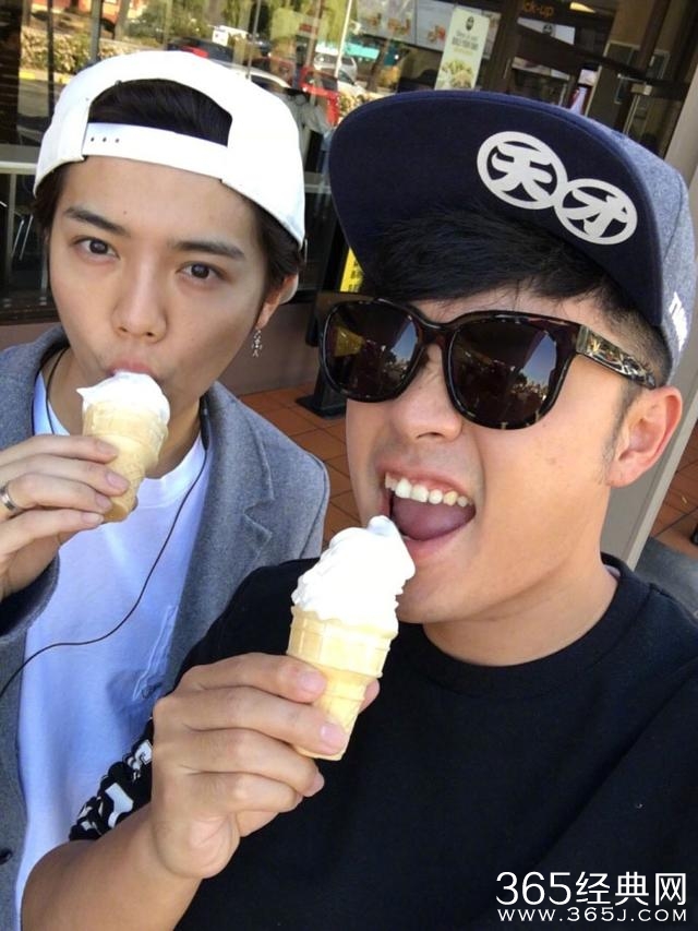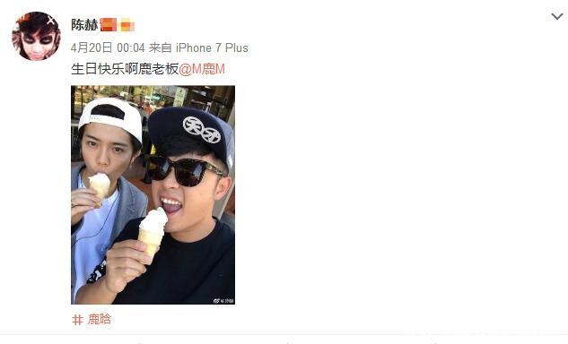 陈赫爆照说:生日快乐啊鹿老板!照中鹿晗与他合照,两人吃冰激凌,这俩帅哥好帅,祝鹿晗生日快乐!
