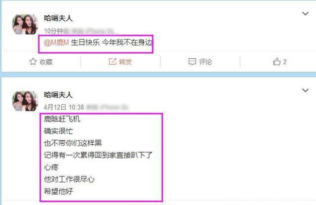 这个人就是哈噶夫人,她在4月19日,就是昨天23点多的时候就说:“鹿晗生日快乐,今年我不在身边!”。哎妈!这是半夜秀恩爱吗?前面她还帮鹿晗说话,说鹿晗很忙,也不让那些黑子黑鹿晗!还说鹿晗很好!