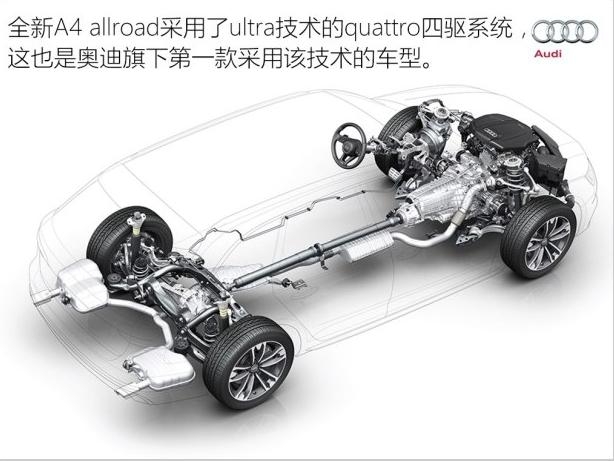 quattro ultra系统的核心为中央电控多片式离合器(位于变速箱的后侧),可通过电机调节多片式离合器的压紧程度,来调节分配前后轴之间的动力,这就意味着采用纵置发动机布局的奥迪车型也将从原本的全时四驱转变为适时四驱了。此外,该四驱系统还在后桥右半轴上设置了牙嵌式离合器,把右后半轴分开成了两截,作用则是用来控制后轴与中央传动轴之间动力连接的通断。