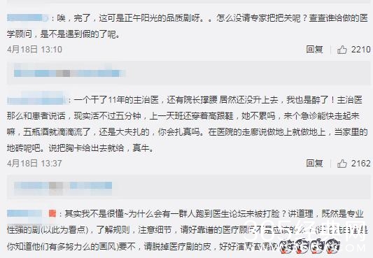 作为打着医疗剧的名号做宣传,号称专业的职业剧,第一集就暴露出很多医学错误。让观众质疑,合着医疗剧只剩下医闹?护士医生上班就穿高跟鞋,西装,连头发也不理下?剧情连基本的专业都没做到位,却还想体现医生这个职业。这就是网友们吐槽的重点。