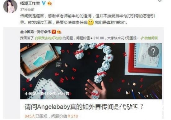 有网友向卓伟提问,baby是代孕?工作室辟谣:不接受恶意引导。而baby的话也是嘲讽得相当到位:转发超过五百也是要负法律责任哦,我们真的“爱您”。
