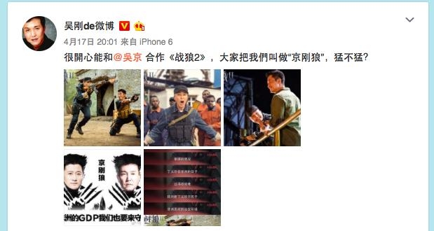 而吴京虽然没有抱大腿,但是达康书记的@也让他的《战狼》有所收益。