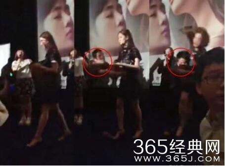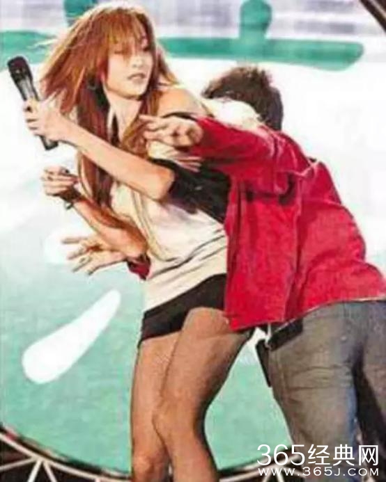 出席活动在舞台上唱歌的张柏芝,被突然跑上台的男粉丝熊抱险扑倒。柏芝应该也有被吓到,但表现得还是比较“淡定”的。