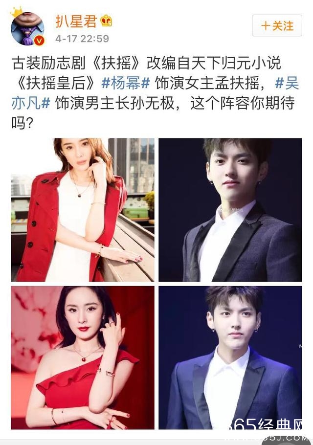 而杨幂似乎要和流量小生合作个遍 ,之前和鹿晗搭档了《我是证人》、接着喝黄子韬搭档了电视剧,如今的话,由她主演的电视剧《扶摇皇后》搭档的男主便是吴亦凡