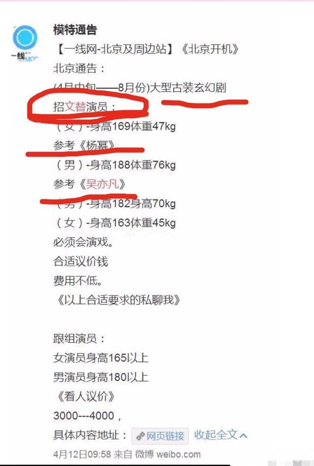咕咕对于吴亦凡出演电视剧并不意外,意外的则是,咕咕刷到了这样一则招聘的广告,看这招聘的信息,应该就是吴亦凡和杨幂主演的电视剧,剧组招的居然又是文替