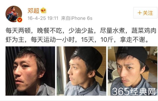 邓超发微博公布减肥方法,15天瘦10斤,是不是很动心啊?那就做起来吧:每天两顿,晚餐不吃,少油少盐,尽量水煮,蔬菜鸡肉虾为主,每天运动一小时。