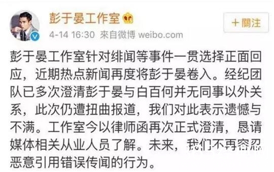 白百何出轨事件越演越烈的时候,曾经与白百何合作过的彭于晏再次躺枪,彭于晏工作室回应称彭于晏和白百何是正常的同事关系,不再容忍恶意引用传闻的行为。
