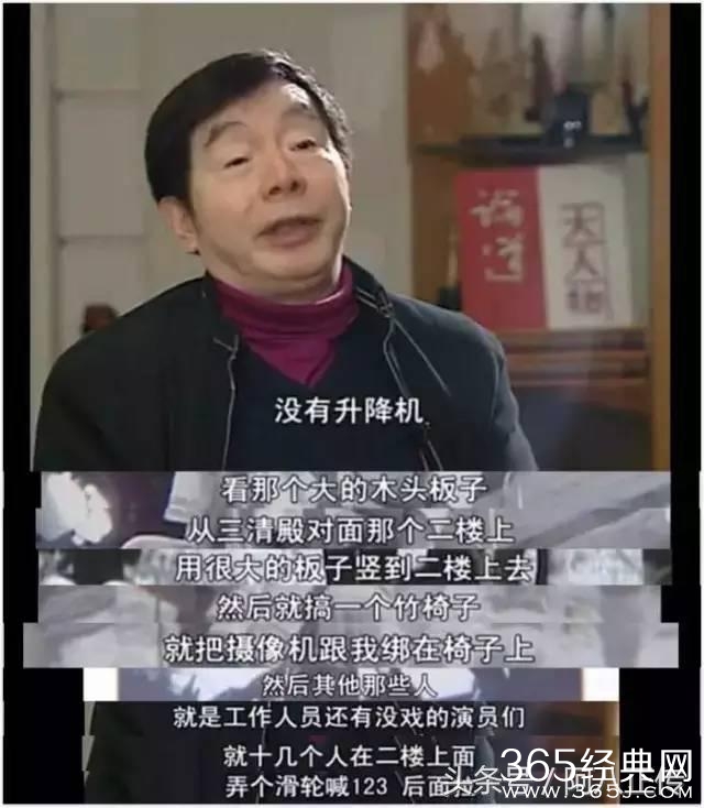 为了拍出孙悟空被师傅念紧箍咒的晕眩状态,王崇秋自己就充当了人肉升降机:“没有升降机,看那个大的木头板子,从三清殿对面那个二楼上,用很大的板子竖到二楼上,然后就搞一个竹椅子,就把摄像机跟我绑在竹椅子上,十几个工作人员就在二楼弄个滑轮喊123,拉。”