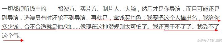 一切都得听钱主的——投资方、买片方、制片人、大腕,然后才是你导演。而且可能还是副导演、选演员有时还轮不到导演。再就是,拿钱买角色:我要把这个人捧出名,我给你多少钱,合不合适就是他/她……像现在这种潜规则太可怕了。我还真干不了了。我受不了这个气。”