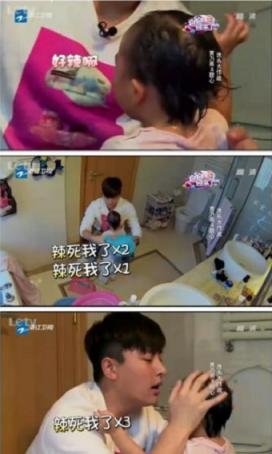 洗头的时候,洗发水进眼睛了:好辣呀!辣死我了~一边哭喊着一边要报告妈妈。
