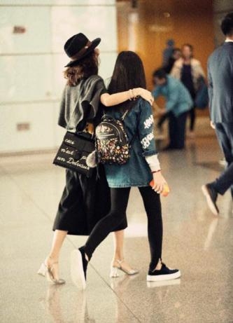 俩个人穿着姐妹装,可见是经过细心搭配;而且离去时俩人的手十指相扣。
