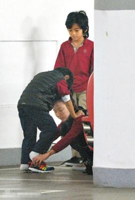 无论在任何场合,把目光放在两个孩子身上的张柏芝总能第一时间蹲下为儿子系鞋带。