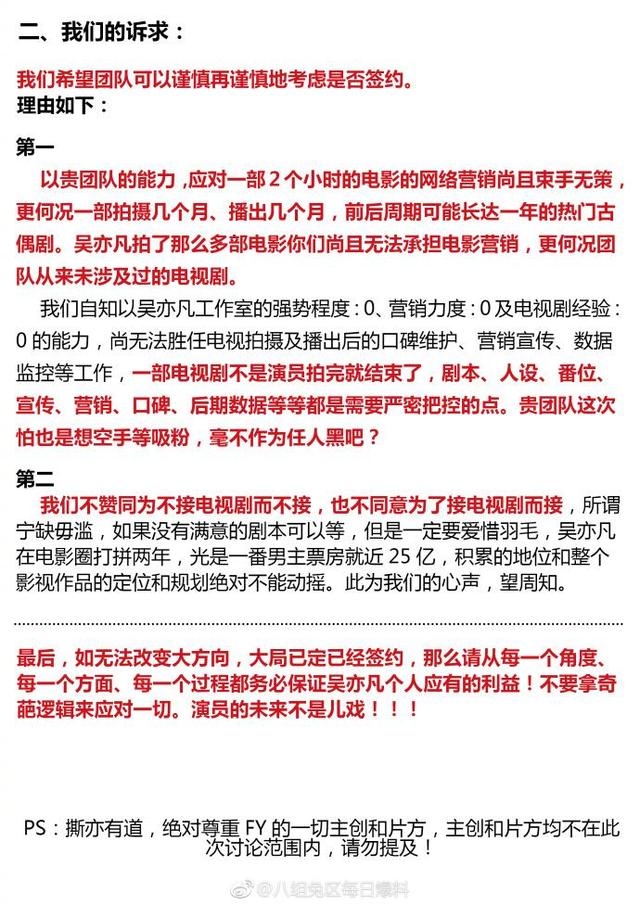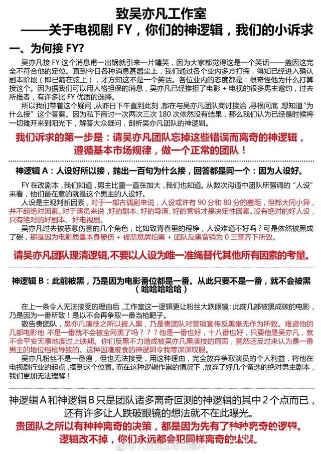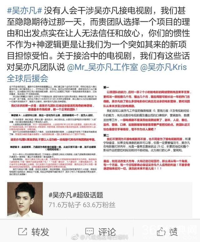 对此,吴亦凡粉丝却手撕了吴亦凡团队,粉丝提出,希望团队不要为了不接电视剧而不接,也不要为了接电视剧而接,演员未来不是儿戏。 这次粉丝重点不是接电视剧,而是希望换团队。