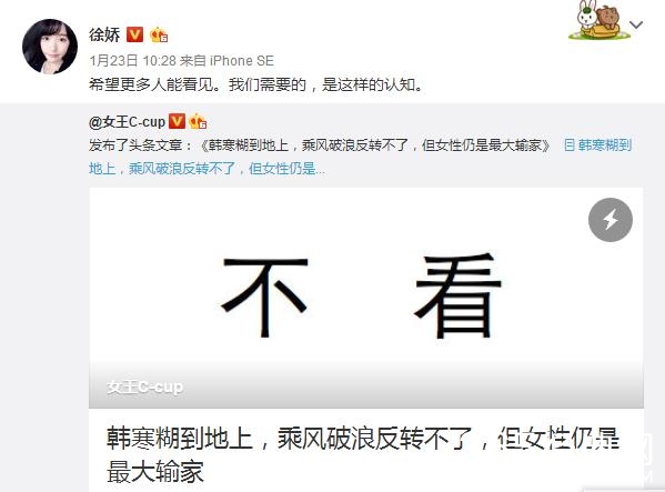 除了这些,她还经常为女权发声,为此甚至不怕得罪同行。比如前不久韩寒被批为直男癌的时候,徐娇就在微博旗帜鲜明地表达了自己的看法。