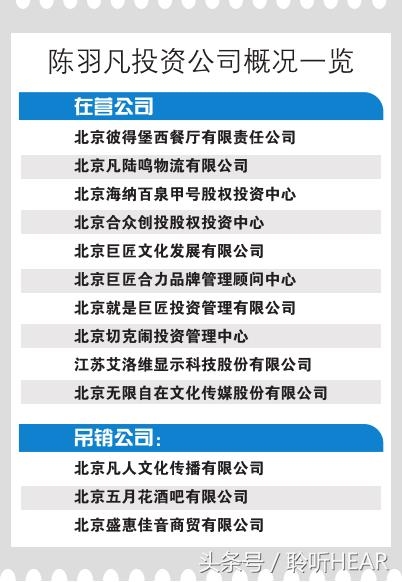 除了歌手的身份之外,陈羽凡还有着一张“投资人”的职业名片,他所投资的公司更是涉及文化演出、艺人经纪、餐饮、物流等多个领域。据知情者透露,陈羽凡的投资人身份甚至还要早过许多其他同期明星。北京商报记者通过查阅公开资料发现,早在2002年,陈羽凡成为北京五月花酒吧有限公司的股东。2003年,成立仅一年的北京盛惠佳音商贸有限公司则也被纳进了陈羽凡的投资版图之中。