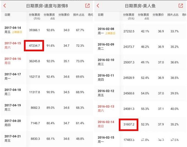 从两部影片的票房增长曲线来看,《速度与激情8》最高单日票房出现在上映第二天,分账票房高达惊人的4.72亿元。此后票房基本是一路走低,上映第6天单日票房跌破亿元。本周末应该会有反弹,但从目前的势头来看,应该不会太高;而《美人鱼》最高单日票房为3.16亿元,居然出现在上映第七天!连续14天单日票房在1亿元以上,其票房走势之稳健远超《速度与激情8》。