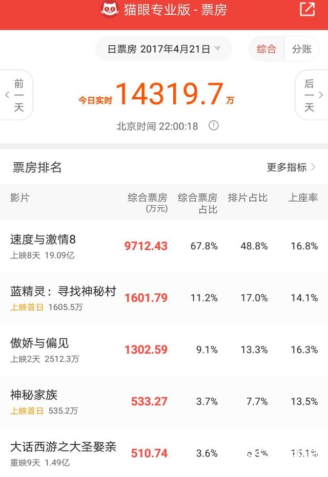 4月21日是周五,有包括《蓝精灵3:寻找神秘村》在内的10部新片上映,但因为《速度与激情8》票房增长势头明显下降和《蓝精灵3》表现不佳,中国内地电影市场票房并未出现像上周五那样的井喷。截至22点,大盘报收1.43亿元,《速度与激情8》拿下9712万元,上映8天累计票房19.09亿元,比《美人鱼》同期票房少近9000万元,总票房超《美人鱼》基本无望!迪丽热巴主演的影片《傲娇与偏见》收获1302万元,在日票房榜上紧紧咬住《蓝精灵3》,后者上映首日仅有1601万元票房。
