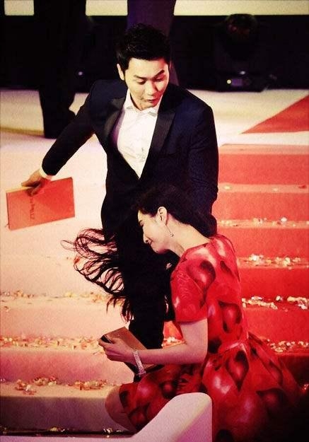范冰冰某次参加活动的时候就是因为穿的鞋子太高了在上台的时候不小心摔倒了。
