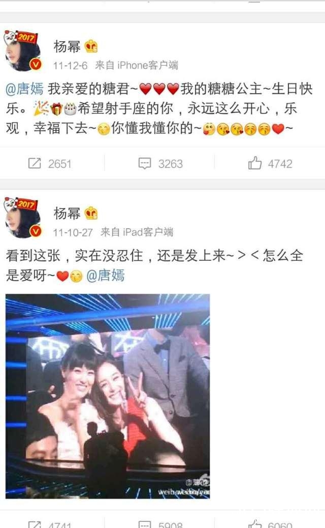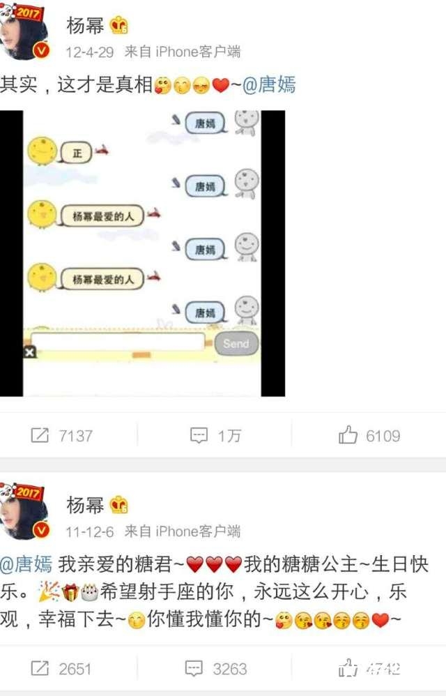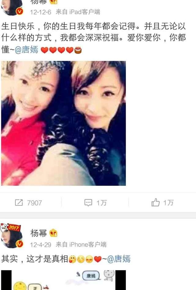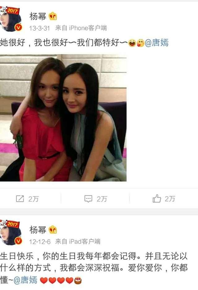 当年,杨幂结婚的时候,唐嫣是娱乐圈唯一被邀请的女明星,并且还是伴娘的身份。在扔新娘捧花的时候大幂幂更是直接将手上的花环送给了唐嫣,还感性的说:“我想把我所有的桃花运都送给你,祝你早日找到幸福。”唐嫣当场感动的潸然泪下。这段视频一流出,两人之间的闺蜜情就被津津乐道,还被称为“中国好闺蜜”。两人之后在节目上和微博上也大秀姐妹情。两人微博互动特别频繁,特别甜蜜。杨幂更是称唐嫣是自己这辈子最爱的女人,唐嫣说杨幂是自己永远的女神。