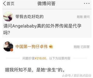 网友带着这份疑问,想寻根问底,自然而言的,当然是找中国内地第一狗仔卓伟解答这个问题啦。网友在微博问答上向卓伟提问了这样的一个问题:请问angelababy真的如外界传闻是代孕吗?卓伟的回答,非常精彩。他表示:据我所知不是;是她“亲生”的!
