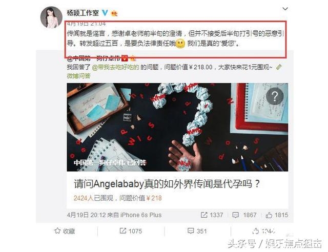 这卓伟的回答很容易让人产生了疑问,主要是他话中的双引号作怪啊。然而,卓伟的回答不久,杨颖工作室也对这条回答,作了一个评论。杨颖工作室:传闻就是谣言,感谢卓老师前半句的澄清,但并不接受后半句打引号的恶意引导。转发超过五百,是要负法律责任哦。我们是真的“爱您”。这个评论可谓是铿锵有力啊,看来高手间的过招都是“杀人于无形”。双方不断地进行互掐,双方的粉丝也开始一系列的攻击。有表示杨颖肯定是代孕,也有表示杨颖绝对不是代孕的。