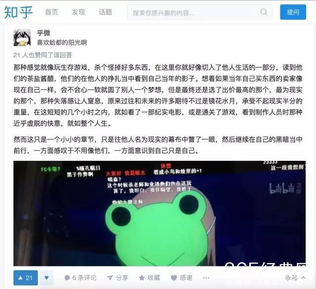 那种感觉就像玩生存游戏,杀个怪掉好多东西,在这里你就好像切入了他人生活的一部分,读到他们的茶盐酱醋,他们的在他人的挣扎当中看到自己当年的影子。想着如果当年自己买东西的卖家像现在自己一样,会不会心一软就圆了别人一个梦想……在这短短的几个小时之内,就如看了一部纪实电影,或是通关了游戏,看到制作人员时那种近乎虚脱的快意,就如整个人生。然而这只是一个小小的章节,只是往他人名为现实的幕布中瞥了一眼,然后继续在自己的黑暗当中前行。