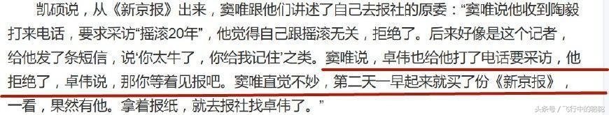 听说,以前卓伟仍旧《新京报》记者,他写了一篇名为《窦唯每月给高原500元糊口费丁武劝其看生理大夫》的报道。由于卓伟没有采访过窦唯就写出了这篇报道,让窦唯看到后,就怒火冲冲的杀到了报社。其后窦唯的伴侣凯硕还原过工作的前后。