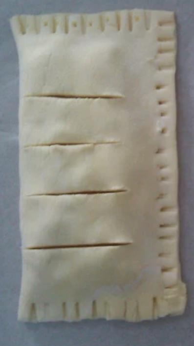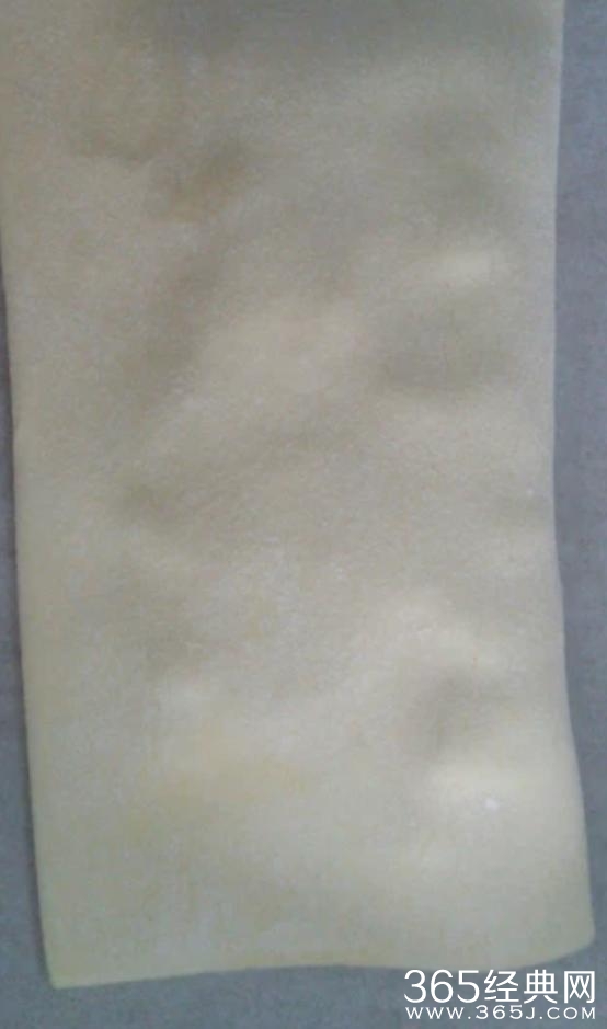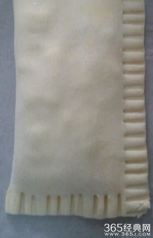 冷藏后的面团擀成0.5厘米左右厚度,宽约20厘米的长方形派皮(长度自由选择哈),在面皮中间放入菠萝馅,