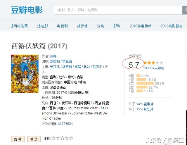 虽然《西游伏妖篇》票房十分可观,但是在口碑难及之前的《西游降魔篇》《美人鱼》,在豆瓣上也仅有惨淡的5.7分。