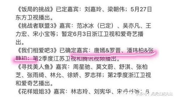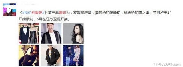 最近网上一份嘉宾名单流出。《我们相爱吧》第三季唐嫣罗晋将会参加,看来我们的未央和拓跋浚穿越现代一起相爱了,等着看撒狗粮吧!当然还有潘玮柏和张静初这一对将会在节目中组cp。