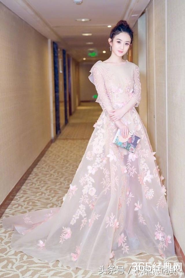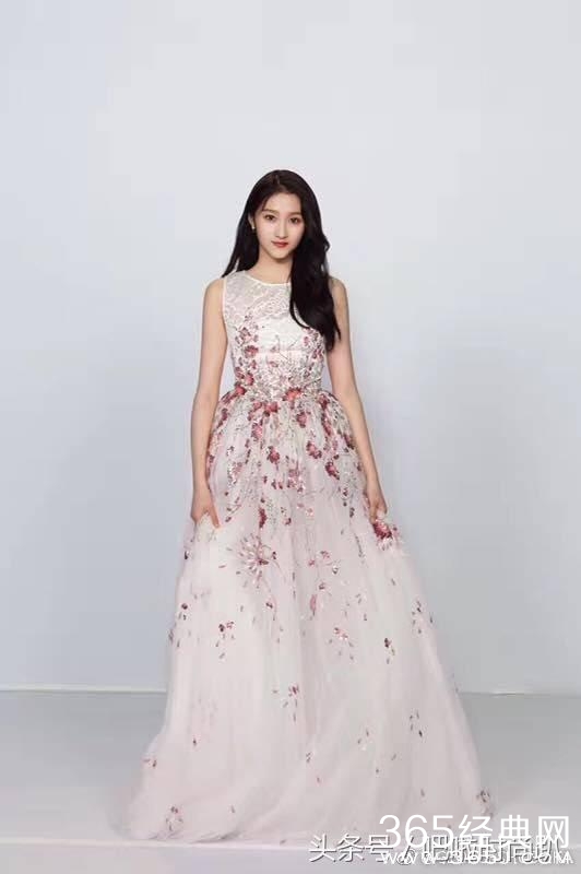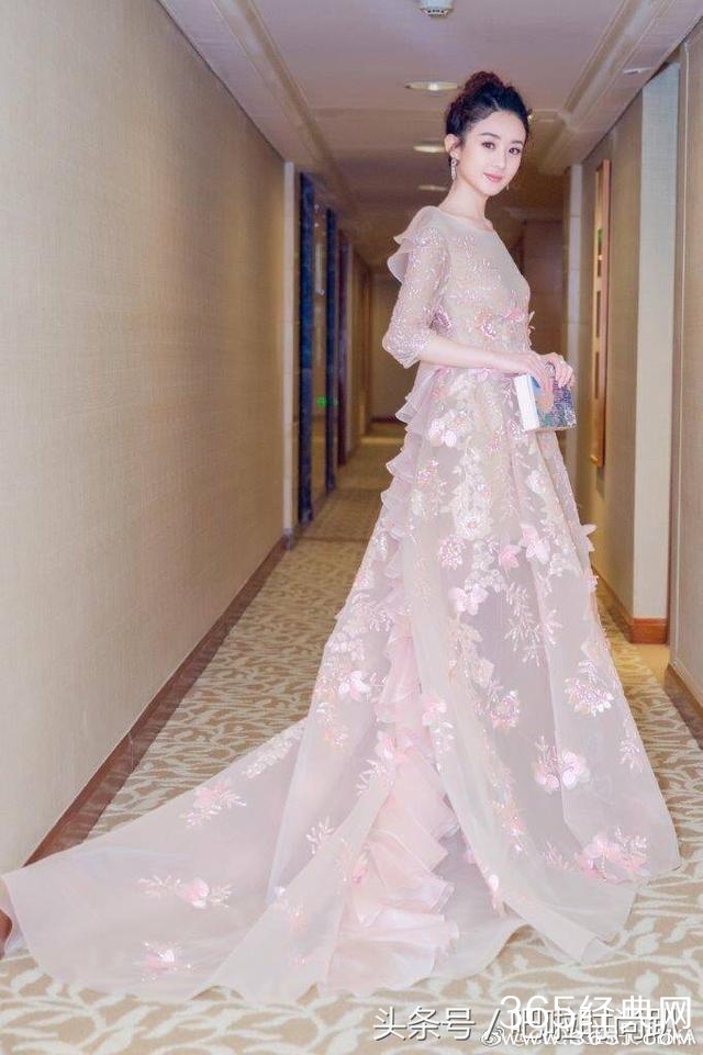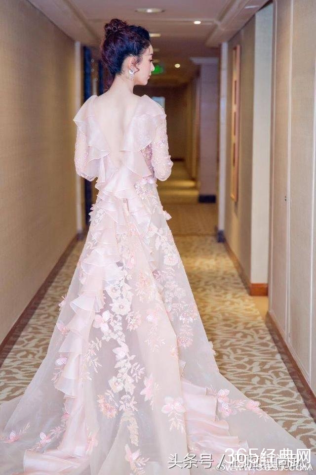粉红色的网纱上面绣满了精致的花朵刺绣,还有恰到好处的露背,还有漂亮的荷叶边儿,真不愧是高定系列呀,裙子真是美的不要不要的,再加上赵丽颖长得这么美,那就是完美~