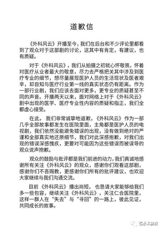 4月19日,《外科风云》官方微博就观众提出的这些批评作出回应并且道歉,称对于这些关于医疗、医学方面内容上的质疑和指正全部都虚心接受。这个剧组的认错态度还是很好的。